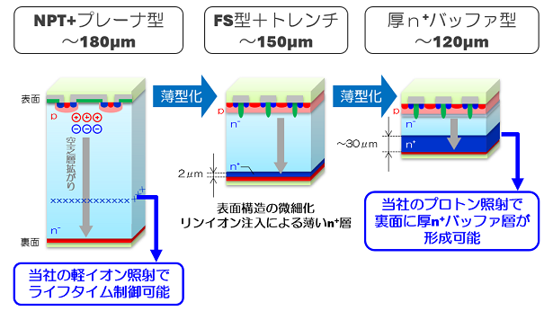 イオンビーム利用サービス n層形成技術 IGBTの構造変化と当社サービス内容の変革 ライフタイム制御 マスク照射技術 n層形成技術 お問い合わせ・資料請求 メールでのお問い合わせ お電話でのお問い合わせ
